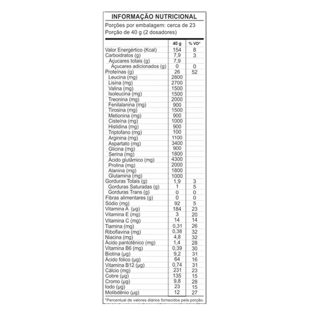 Ingredientes: Proteína Concentrada do soro de leite, Glutamina, mix de vitaminas (acetato de retinol, mononitrato de tiamina, riboflavina, niacinamida, pantotenato de cálcio, cloridrato de piridoxina, cianocobalamina, ácido ascórbico, acetato de tocoferol, D-biotina, ácido fólico, carbonato de cálcio, sulfato de cobre, picolinato de cromo, iodeto de potássio, molibdato de sódio, selenito de sódio), aroma idêntico ao natural de baunilha, edulcorante sucralose, ciclamato de sódio, acessulfame de potássio, sacarina sódica, corante inorgânico dióxido de titânio.