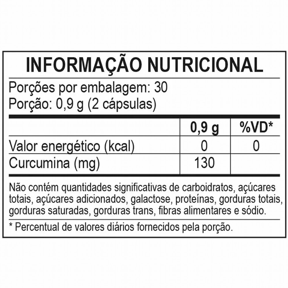 Ingredientes: Extrato de rizomas de cúrcuma longa, agente de massa celulose microcristalina e antiumectante estearato de magnésio. Cápsula: Gelatina vegetal e água purificada.