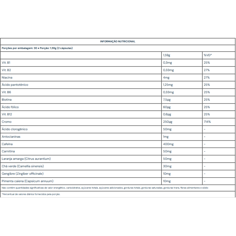 Ingredientes: Café Verde Moído, Cafeína, Extrato De Laranja Moro (Citrus Sinensis L. Osbeck), Tartarato De L-Carnitina, Guaraná Em Pó (Paullinia Cupana), Picolinato De Cromo, Nicotinamida, Pantotenato De Cálcio, Cloridrato De Piridoxina, Biotina, Mononitrato De Tiamina, Riboflavina, Ácido Fólico, Cianocobalamina, Aromatizantes Naturais Extrato Da Casca De Laranja Amarga (Citrus Aurantium), Chá Verde, Gengibre Em Pó, Pimenta Caiena, Agente De Fosfato Tricálcico, Antiumectante Dióxido De Silício, Corantes Azul Brilhante FCF, Eritrosina E Tartrazina, Gelificante Gelatina, Lubrificante Estearato De Magnésio. NÃO CONTÉM GLÚTEN.