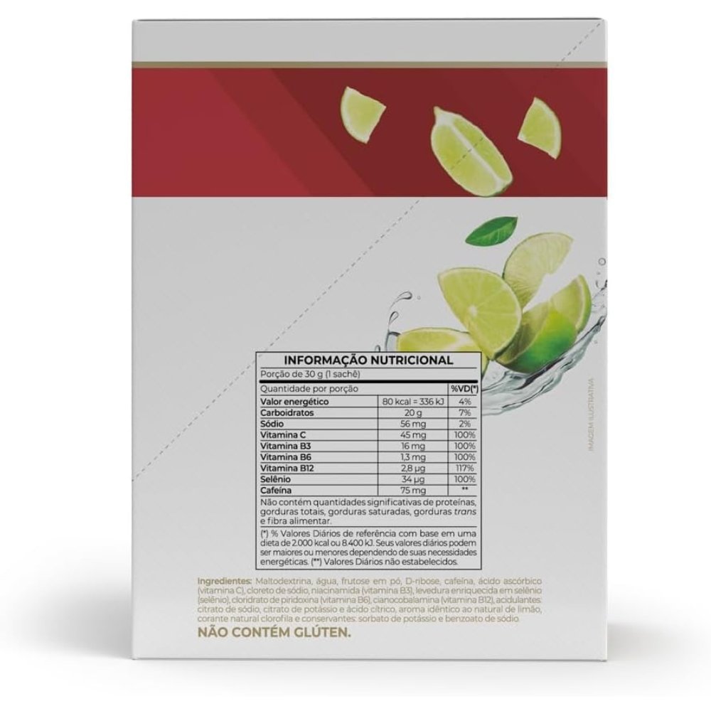Maltodextrina, água purificada, frutose, cafeína anidra, aromatizante natural de limão, acidulante ácido cítrico, conservadores sorbato de potássio e benzoato de sódio, espessante goma xantana e edulcorante sucralose.