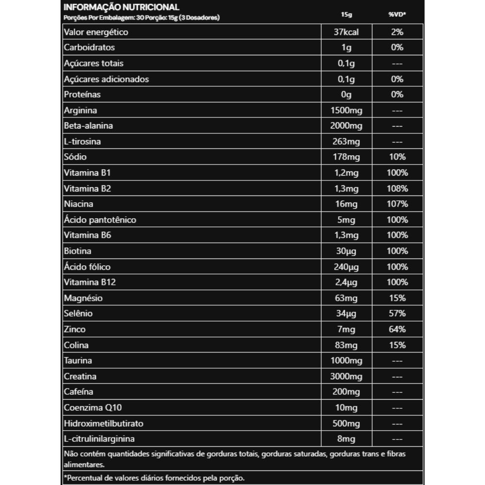 Ingredientes: Creatina, beta-alanina, cloridrato de L-arginina, taurina, maltodextrina, hidroximetilbutirato de cálcio, L-tirosina, cafeína, bitartarato de colina, óxido de magnésio, alga chondrus crispus invernal (Citarg®), coenzima Q10, nicotinamida, óxido de zinco, pantotenato de cálcio, selenito de sódio, cloridrato de piridoxina, biotina, mononitrato de tiamina, riboflavina, ácido fólico,cianocobalamina, acidulante ácido cítrico, antiumectante dióxido de silício e fosfato tricálcico, aromatizantes naturais beterraba em pó e melancia em pó, aromatizante idêntico ao natural, edulcorante sucralose e acessulfame de potássio, regulador de acidez bicarbonato de sódio, corante vermelho ponceau 4R.