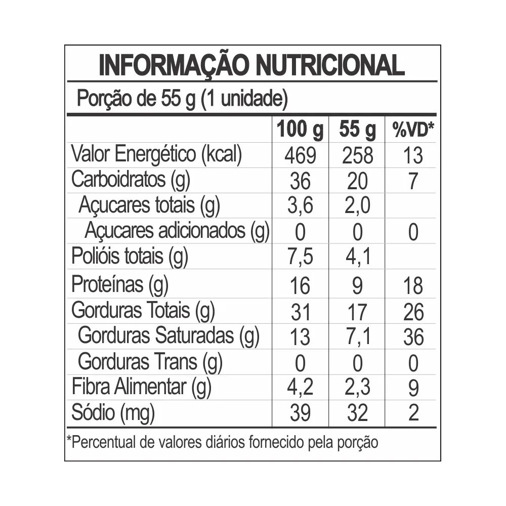 Ingredientes: Recheio de doce de leite: sacarose, soro de leite, proteína de leite, glucose de milho, amido modificado, leite em pó, estabilizante citrato de sódio (INS331), emulsificante monodigliceridios de ácidos graxos (INS471) e regulador de acidez bicarbonato de sódio (INS500), conservante sorbato de potássio (INS202), enzima lactase. Cobertura sabor chocolate meio amargo: farinha de trigo enriquecida com ferro e sacarose, amido de milho, gordura, açúcar invertido, cacau em pó, emulsificante lecitina de soja (INS322), fermento químico bicarbonato de sódio (INS500) e bicarbonato de amônia (INS503), conservantes propionato de cálcio (INS282) e aromatizantes. CONTÉM GLÚTEN, CONTÉM LACTOSE E CONTÉM LEITE, AMENDOIM E DERIVADOS DE LEITE E SOJA. DERIVADOS DE TRIGO. PODE CONTER AVELÃ E CASTANHA DE CAJU. PODE CONTER CEVADA.
