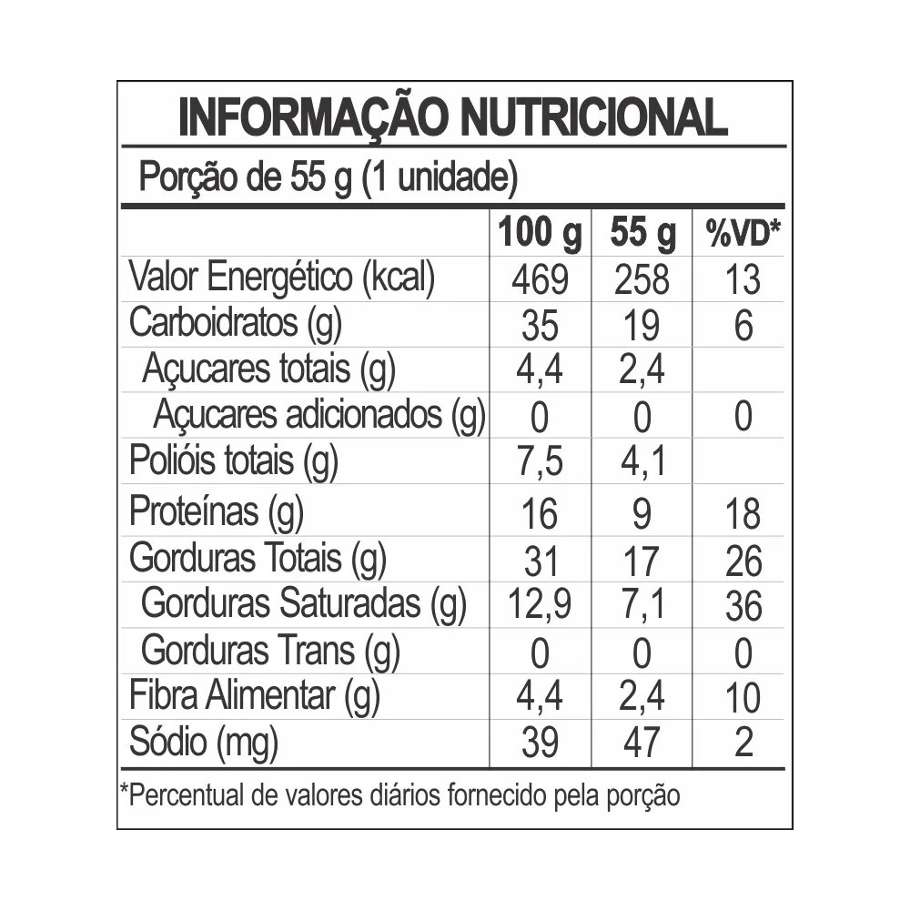 Ingredientes: Recheio de doce de leite: sacarose, soro de leite, proteína de leite, glucose de milho, amido modificado, leite em pó, estabilizante citrato de sódio (INS331), emulsificante monodigliceridios de ácidos graxos (INS471) e regulador de acidez bicarbonato de sódio (INS500), conservante sorbato de potássio (INS202), enzima lactase. Cobertura sabor chocolate meio amargo: farinha de trigo enriquecida com ferro e sacarose, amido de milho, gordura, açúcar invertido, cacau em pó, emulsificante lecitina de soja (INS322), fermento químico bicarbonato de sódio (INS500) e bicarbonato de amônia (INS503), conservantes propionato de cálcio (INS282) e aromatizantes. CONTÉM GLÚTEN, CONTÉM LACTOSE E CONTÉM LEITE, AMENDOIM E DERIVADOS DE LEITE E SOJA. DERIVADOS DE TRIGO. PODE CONTER AVELÃ E CASTANHA DE CAJU. PODE CONTER CEVADA.